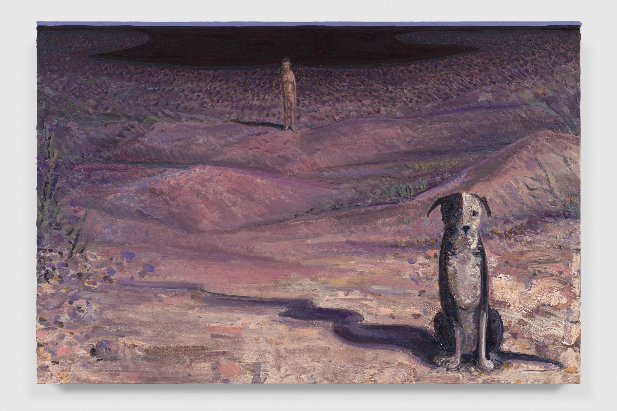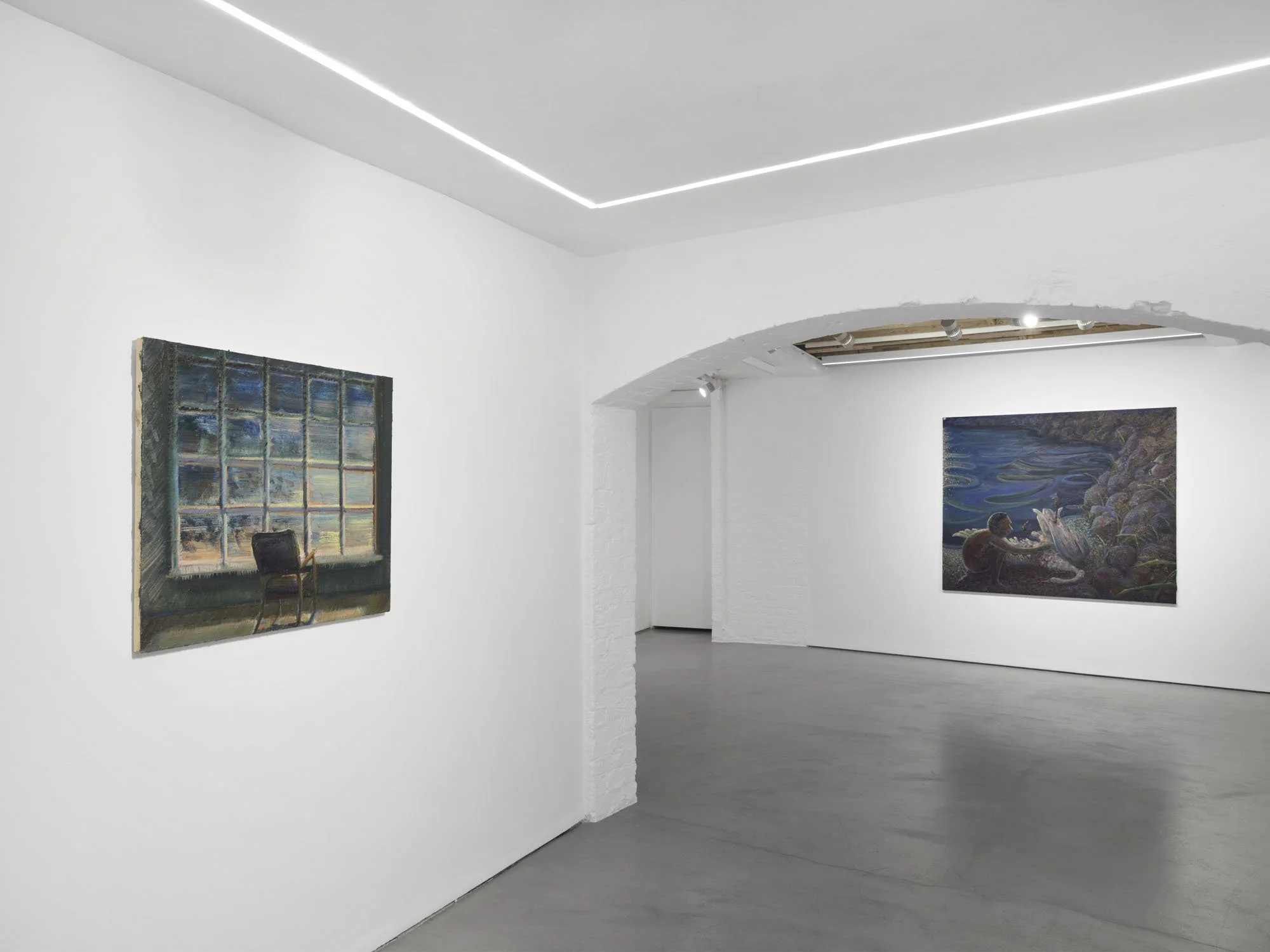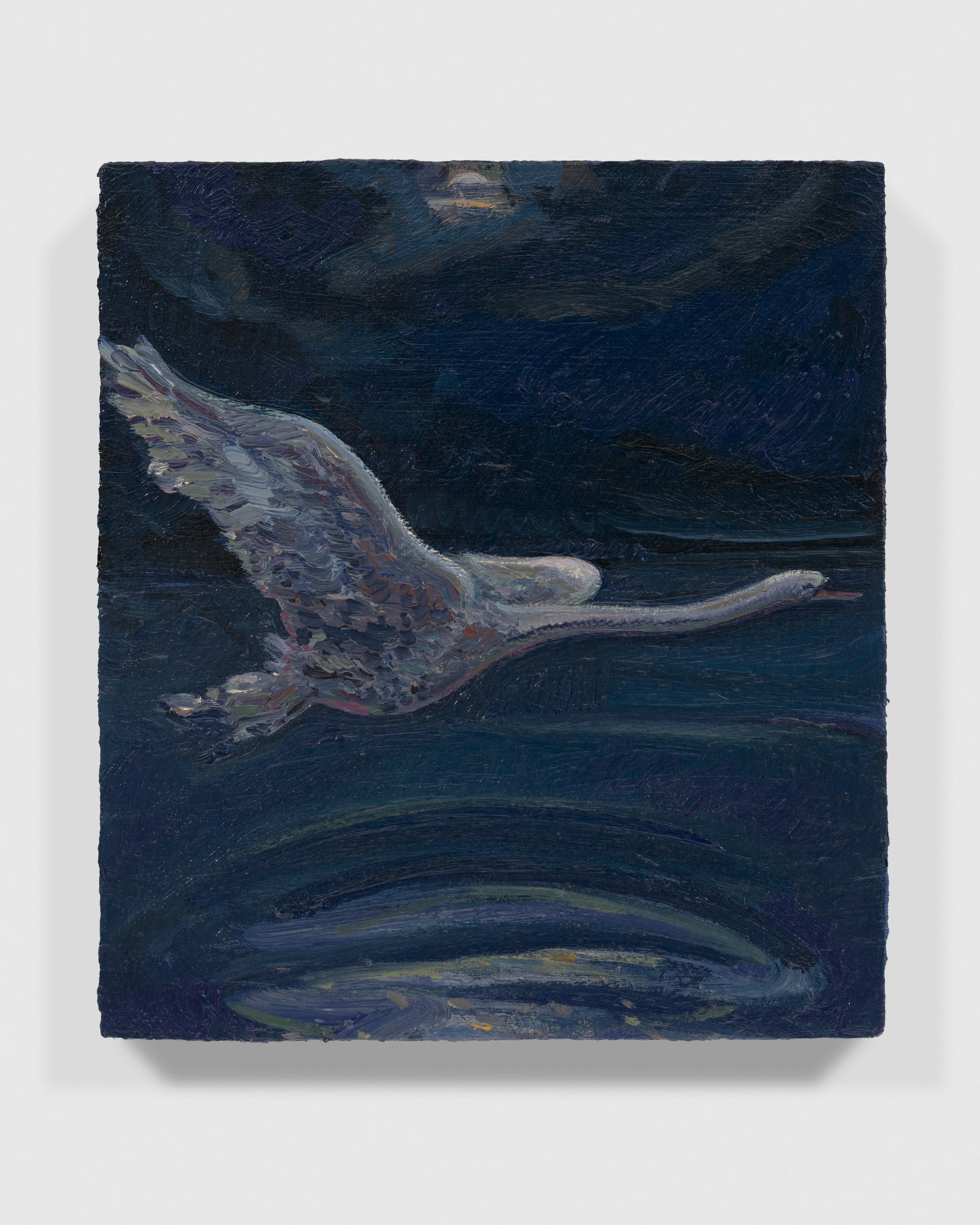 The subjects and stages in Lai’s paintings draw from the legacy of suburban longing found in the work of American painters Edward Hopper and Andrew Wyeth, as much as the architectural liminalism of European modernists Giorgio de Chirico and Yves Tanguy. They are loaded with presence with or without figures. The animals that inhabit his pictures are familiars, vessels for the drives of the human protagonists and totems for their contemplation. The recurring motif of the swan implies an unknowable or unreachable character, elegant and aloof. It’s presence as a foil is emblematic of the yearning within Lai’s work, a desire for connection, intimacy and understanding.