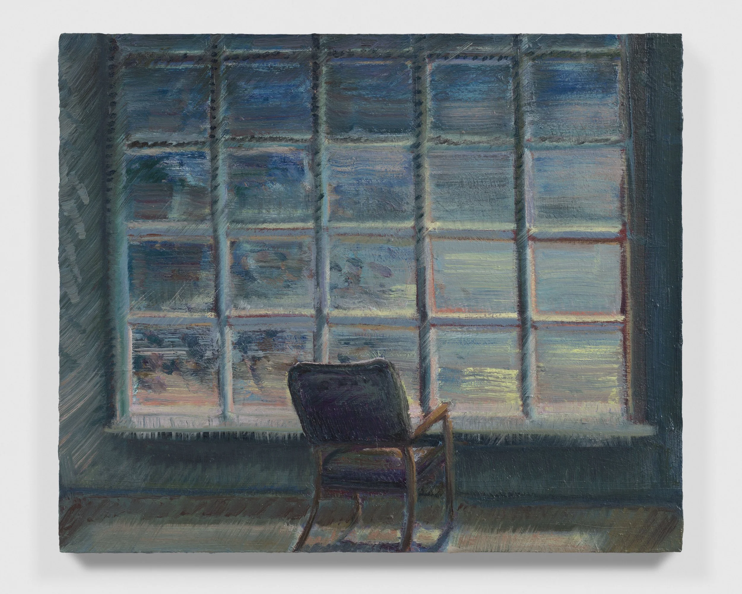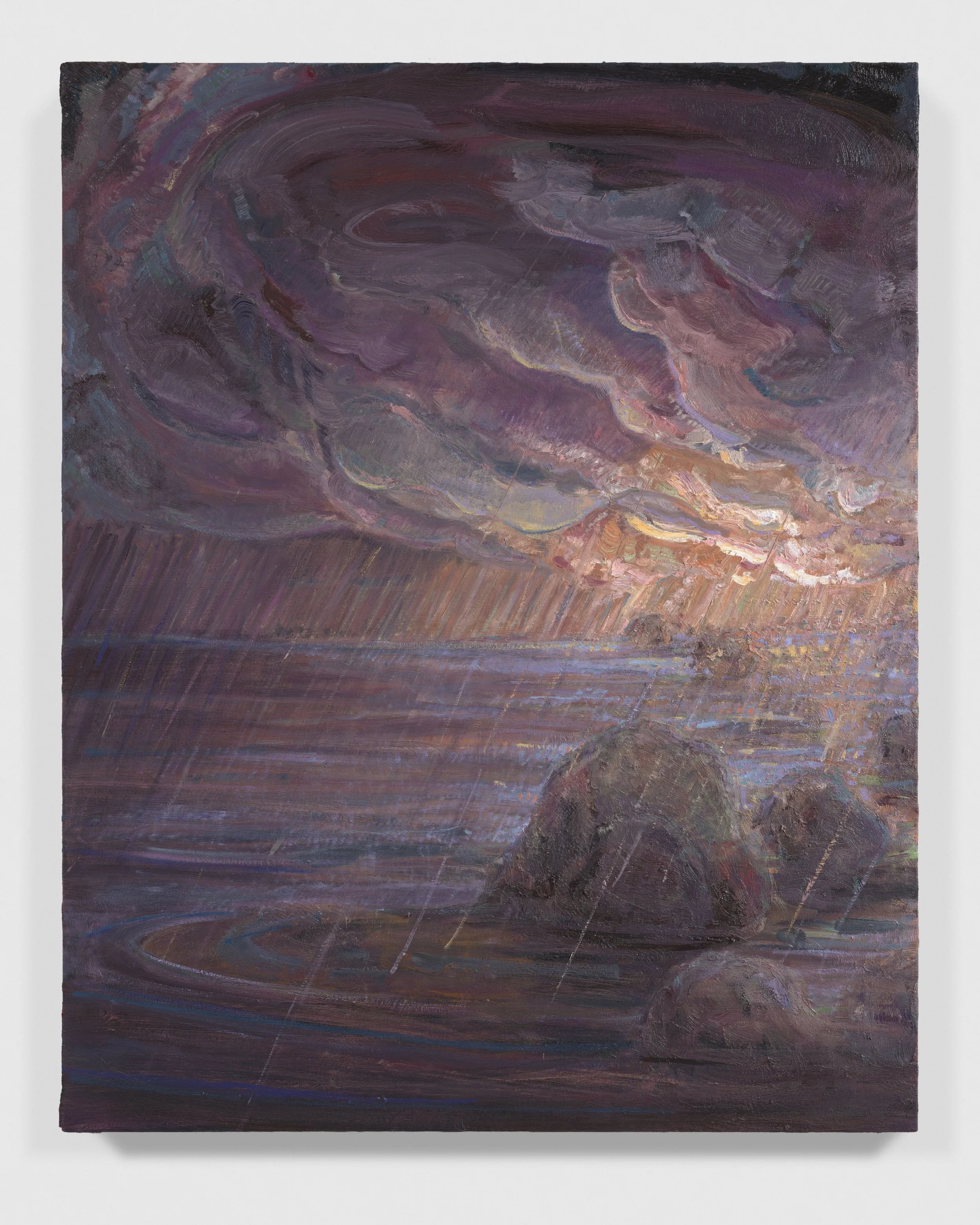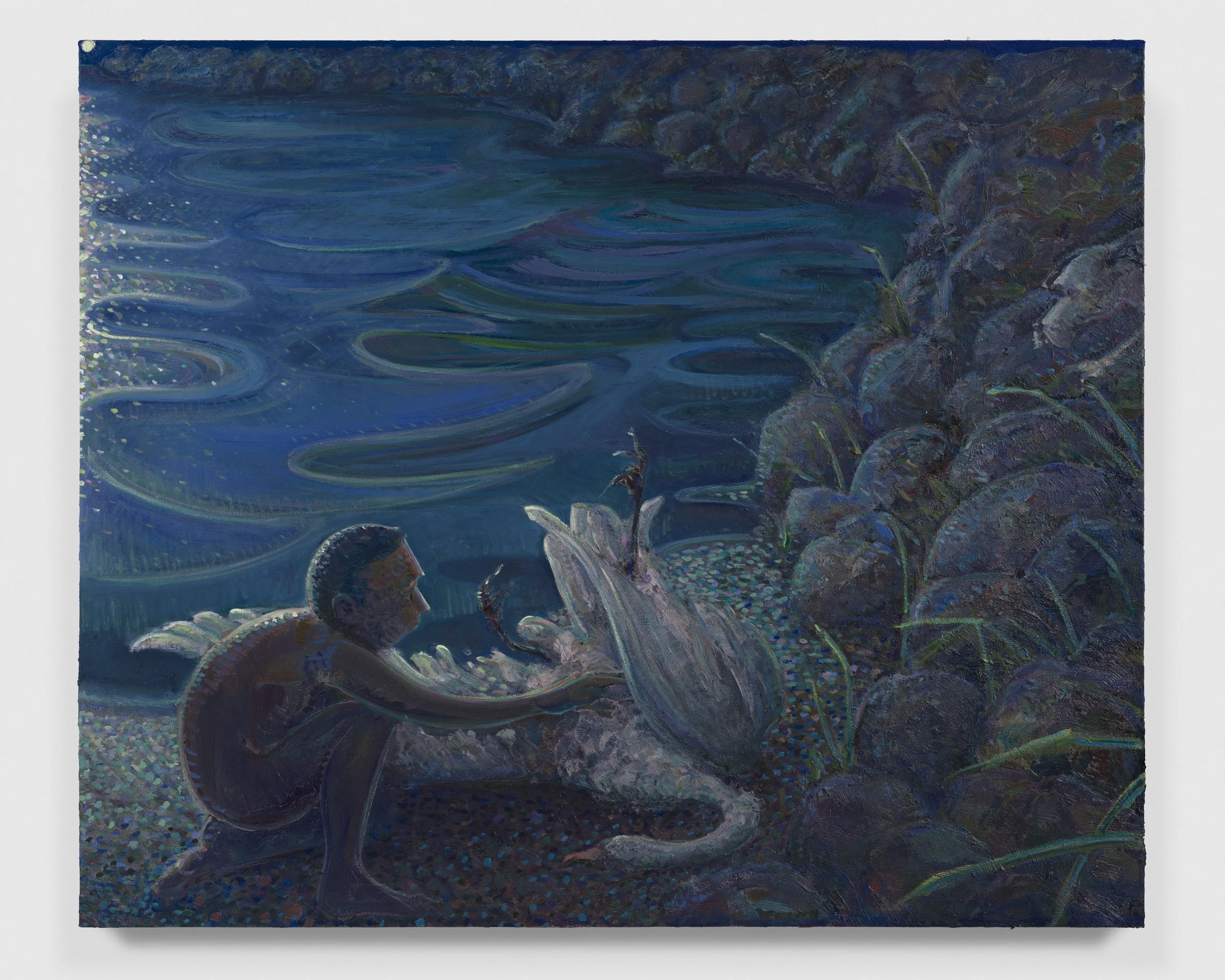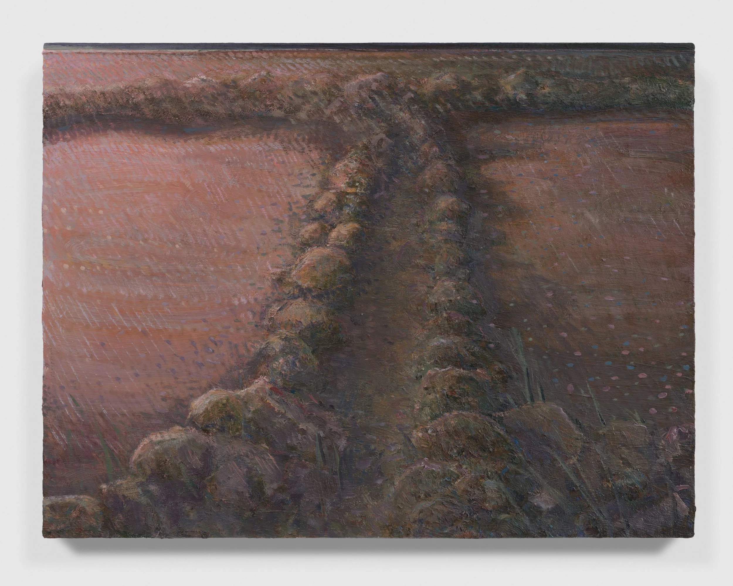The landscape around Lai’s home has been the chief source of inspiration for this series of paintings executed across the past autumn and winter. Salter Grove Memorial Park conjoins the bluntly named Marsh Island and Rock Island there, two crescent jetties cradling small coves along the Providence River. Each island’s banks rise low out of the water, bordered by boulders and reeds, ensnaring dawn cobwebs and framing views of local waterfowl. Beyond the arcing boundary of the jetties, freight ships chug by on their daily deliveries beneath a low sky. You can see the weather coming in from that vantage point and weigh up the time left before the turn back to home.