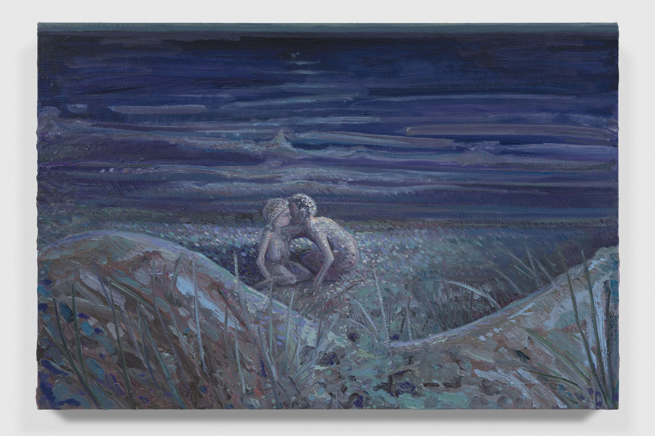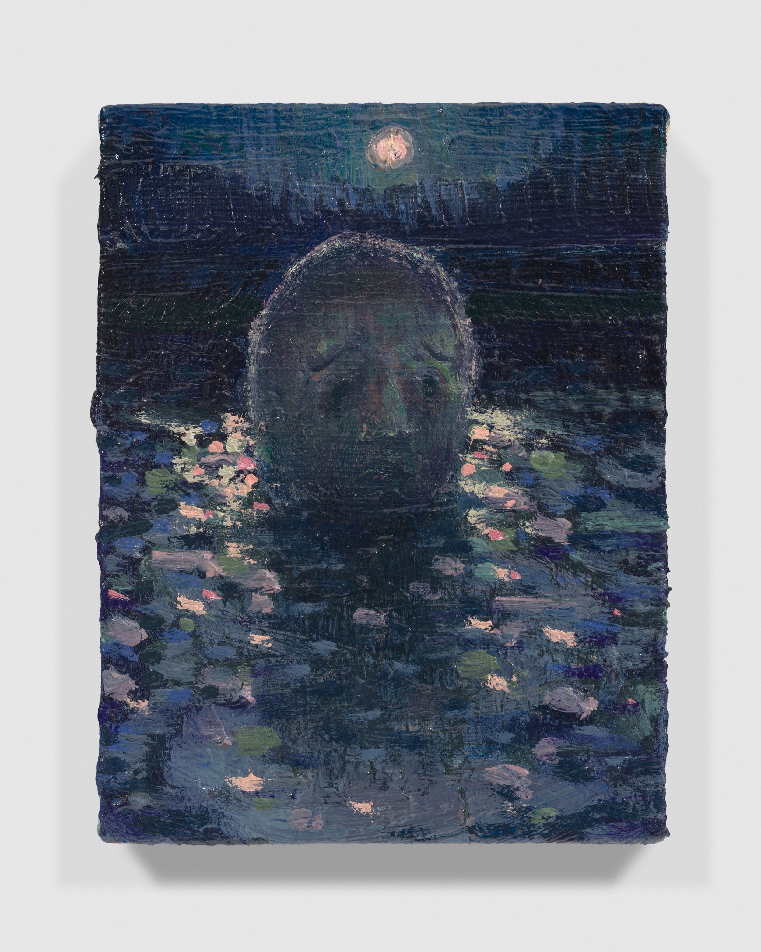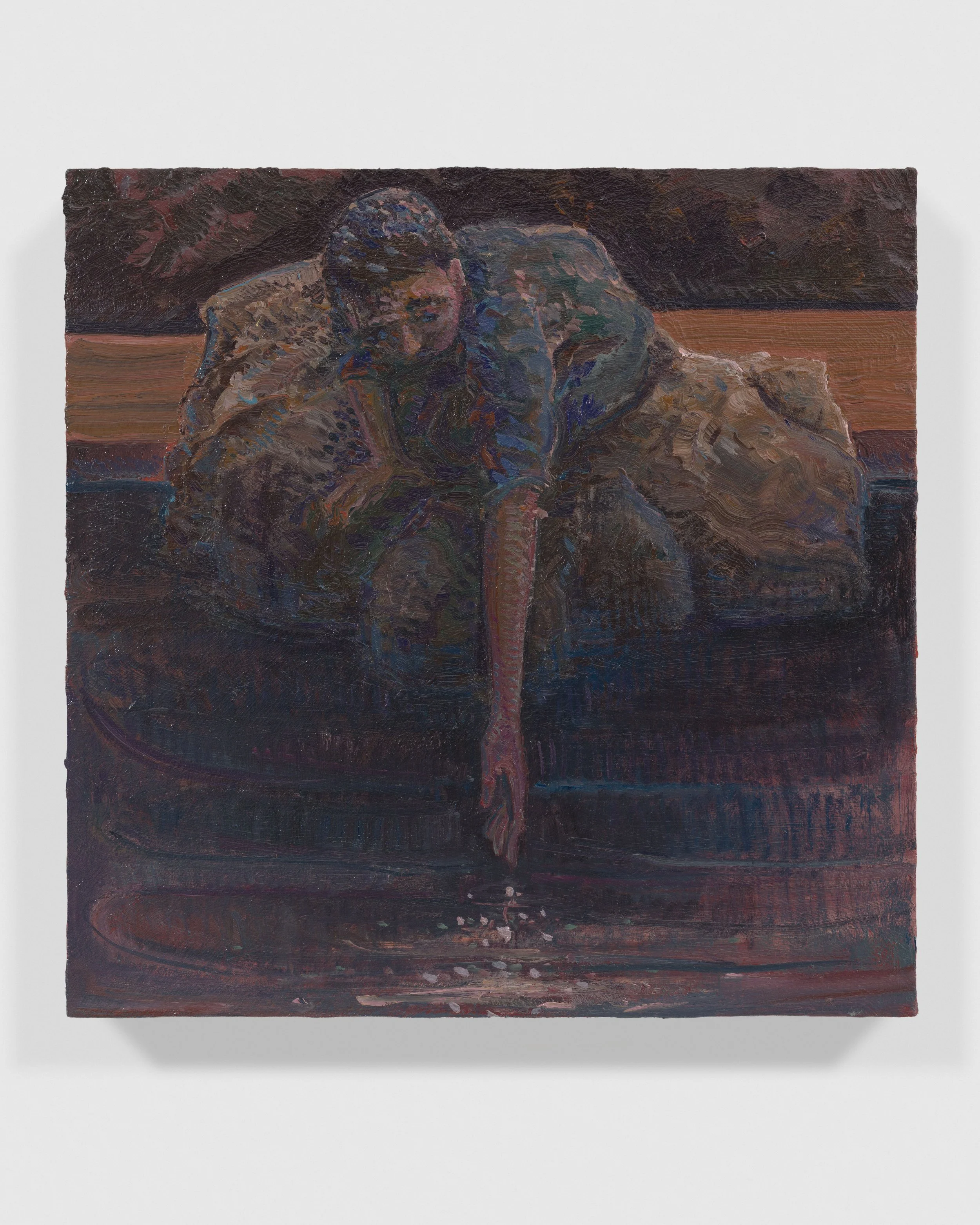 The landscape around Lai’s home has been the chief source of inspiration for this series of paintings executed across the past autumn and winter. Salter Grove Memorial Park conjoins the bluntly named Marsh Island and Rock Island there, two crescent jetties cradling small coves along the Providence River. Each island’s banks rise low out of the water, bordered by boulders and reeds, ensnaring dawn cobwebs and framing views of local waterfowl. Beyond the arcing boundary of the jetties, freight ships chug by on their daily deliveries beneath a low sky. You can see the weather coming in from that vantage point and weigh up the time left before the turn back to home.