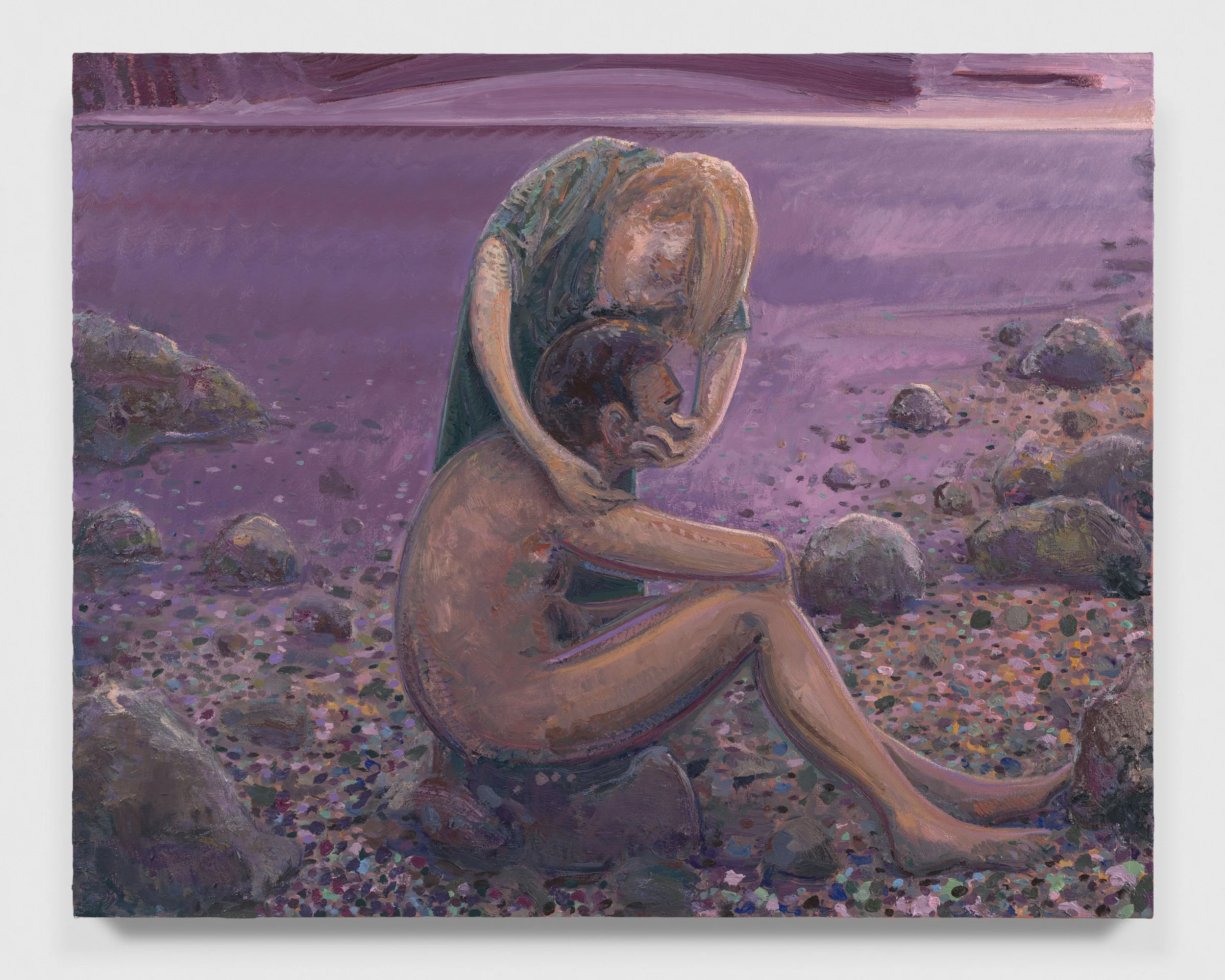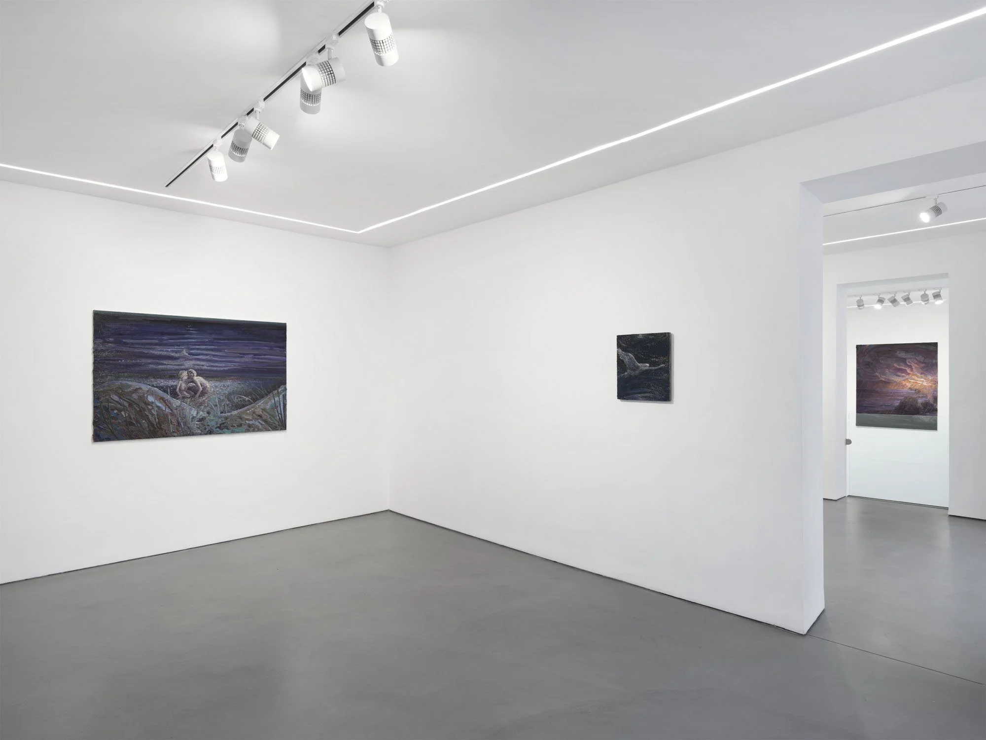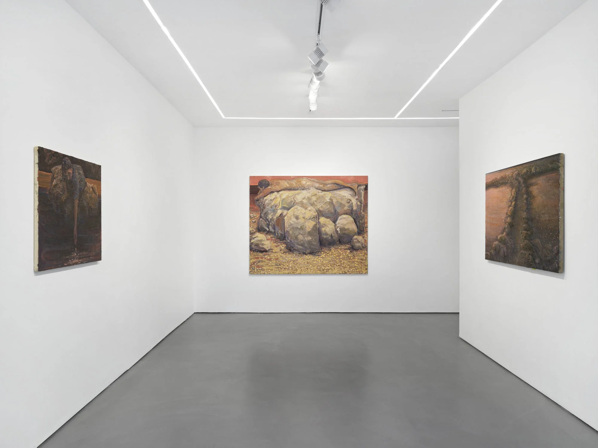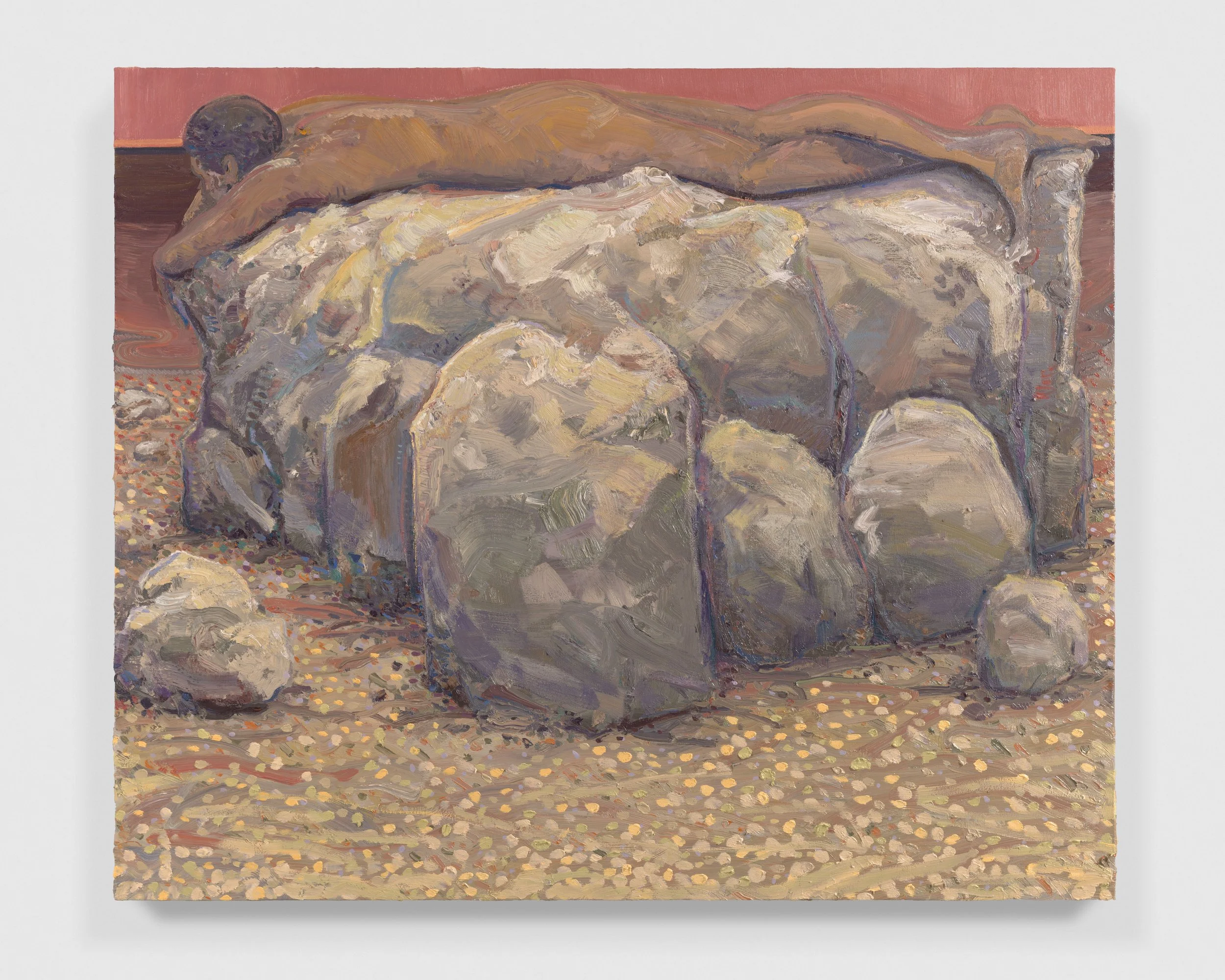 The landscape around Lai’s home has been the chief source of inspiration for this series of paintings executed across the past autumn and winter. Salter Grove Memorial Park conjoins the bluntly named Marsh Island and Rock Island there, two crescent jetties cradling small coves along the Providence River. Each island’s banks rise low out of the water, bordered by boulders and reeds, ensnaring dawn cobwebs and framing views of local waterfowl. Beyond the arcing boundary of the jetties, freight ships chug by on their daily deliveries beneath a low sky. You can see the weather coming in from that vantage point and weigh up the time left before the turn back to home.